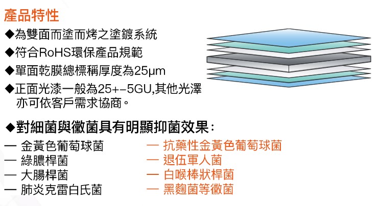 鋼捲表面含有高效奈米級長效穩定之抗菌成分塗膜, 能有效抑制細菌的生長,